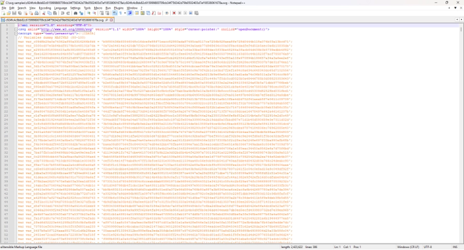 A clean SVG file is typically readable XML defining shapes, colors, and coordinates. For example, a simple SVG may include a shape and a small script used for animation or interaction.In malicious samples, researchers observed: