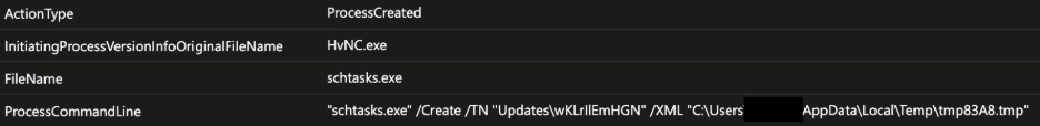 Initial static analysis of the Phantom Stealer payload revealed that the original file name was HvNC.exe. Upon execution, a hidden file titled wKLrllEmHGN.exe was created, followed by a scheduled task creation performed via the following command line: