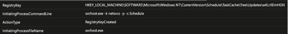 The use of an "Updates" naming convention for the scheduled task is a deliberate social engineering choice, it blends in with legitimate Windows Update tasks and is easy to overlook during triage. The task creation via schtasks.exe automatically generates corresponding registry entries within the HKEY_LOCAL_MACHINE\SOFTWARE\Microsoft\Windows NT\CurrentVersion\Schedule\TaskCache\ key. Specifically, the following registry modification was observed: