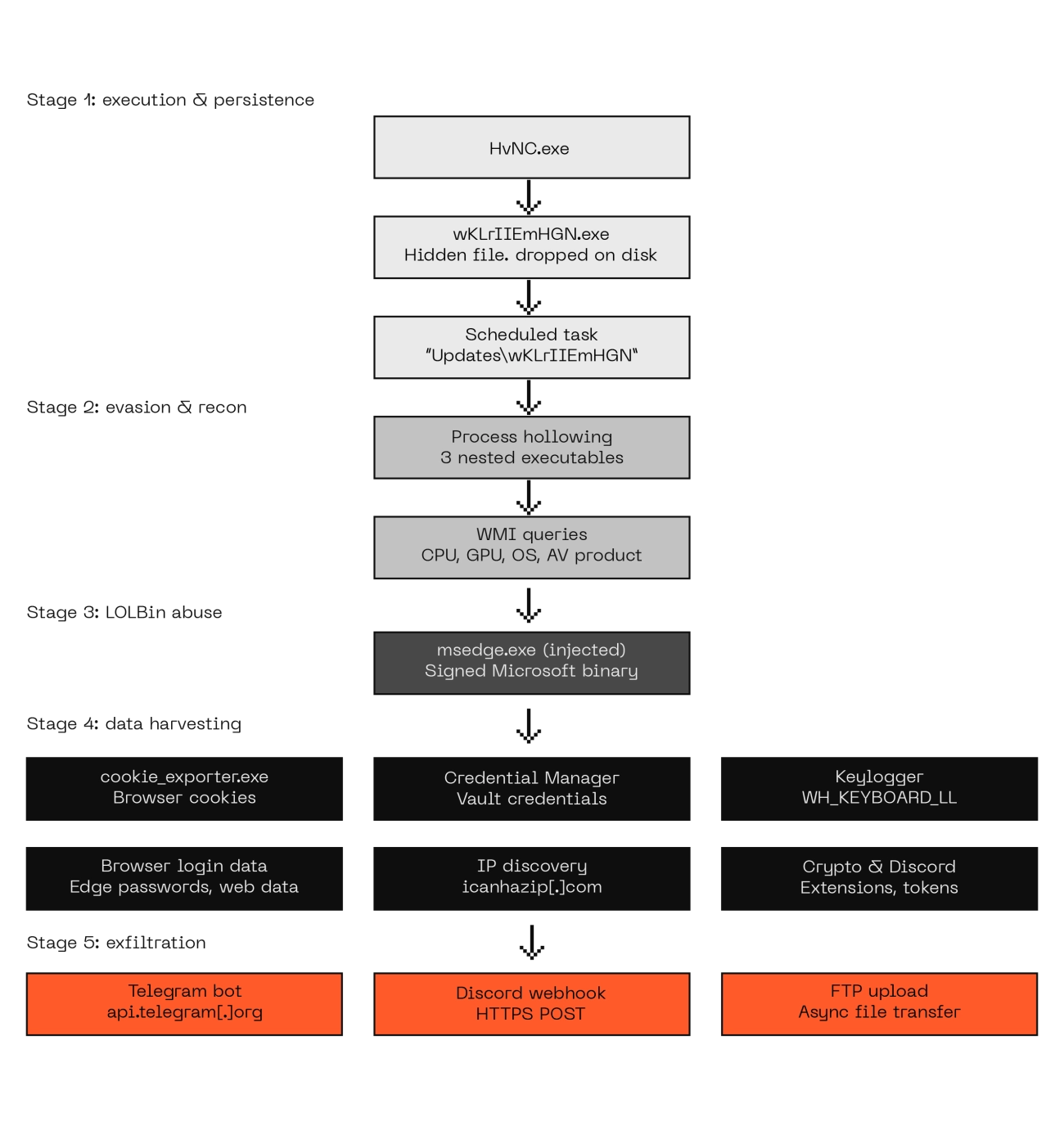 Researchers analyzed a sample of Phantom Stealer in the Binary Defense malware lab to outline the infection chain noted in recent campaigns. The diagram below illustrates the full process flow from initial execution through data exfiltration.