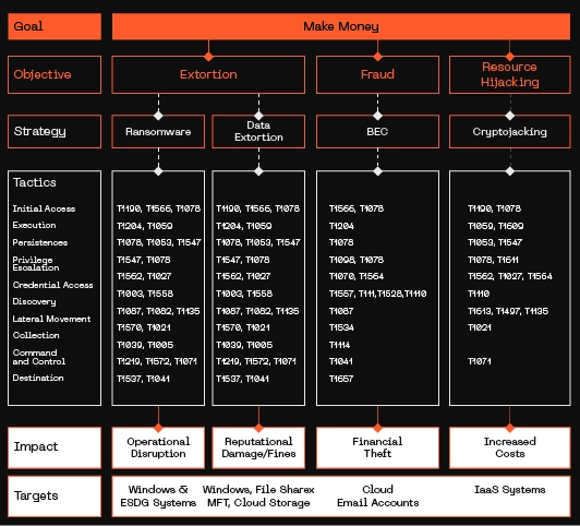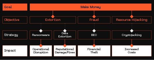 The goal of cybercriminals is to make money and the criminal ecosystem has coalesced around three main objectives: extortion, fraud, and resource hijacking. There are obviously additional cybercrime operations which are used to support these objectives such as credential harvesting, initial access brokers, and phishing platforms however, they should be considered supplemental and have less direct impact to organizations.