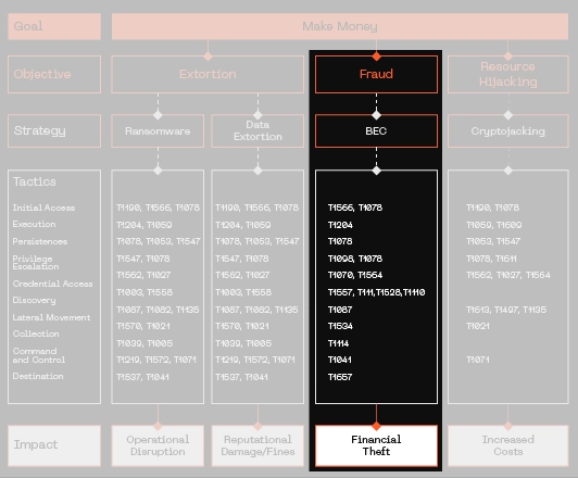 The strategies in which criminals employ to complete their objectives are largely ransomware (extortion), data theft (extortion), business email compromise (fraud), and cryptojacking (resource hijacking).