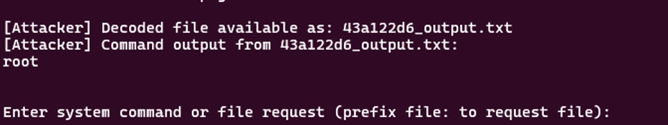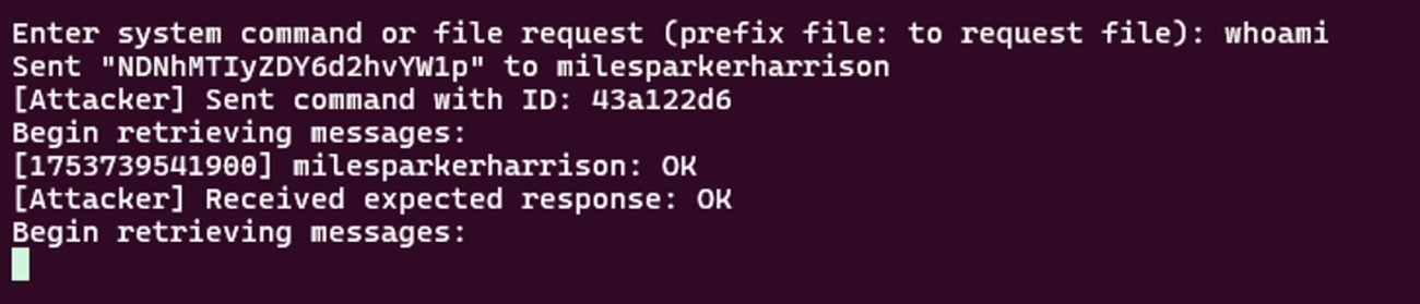 From this point, an attacker may provide any command as instructions for the victim host. Optionally, an attacker may use the `file:`prefix to request a specific file. Following execution of the whoami command in our example, the input is encoded and transmitted to a designated Twitch channel. The server component monitors this channel, decodes the input, and executes the associated command within the client environment: