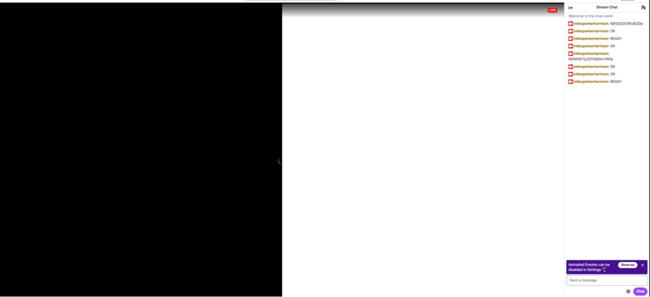 In response, the client application broadcasts a Twitch stream containing video frames embedded with encoded output data. These frames are decoded by the server application, resulting in the following observable response: