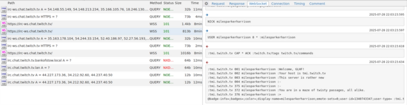 All communications between client and server generate unique network traffic. When intercepted using MiTMProxy, this traffic reveals detailed and distinguishable indicators of C2 behavior in the form of IRC welcome messages created by Twitch, as shown below: